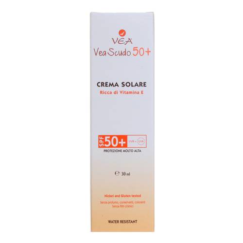 VEA Vea Scudo 50+ CREMA SOLARE VEA SCUDO 50+ contiene OLIO VEA (Vitamina E acetato pura) in percentuale elevata, con azione emolliente, lenitiva e protettiva dai danni cutanei dovuti ai raggi UVA e UVB. Non contiene filtri di tipo chimico. Crema utilizzata per un’abbronzatura sicura ed uniforme nei bambini e nei soggetti con pelli normali o sensibili, su zone delicate o su nei e cicatrici. Indicato in tutte le situazioni che richiedono una protezione solare molto alta. Impiegata anche nei casi di intolleranza o allergia a conservanti, coloranti, profumi e ai filtri solari di tipo chimico. VEA SCUDO 50+ garantisce un rapporto equi...